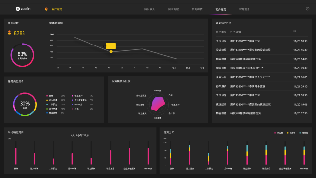 智慧辦公數據一覽,提升服務質量裝修、遷入遷出申請、物業報修、物品放行、最新代辦任務等